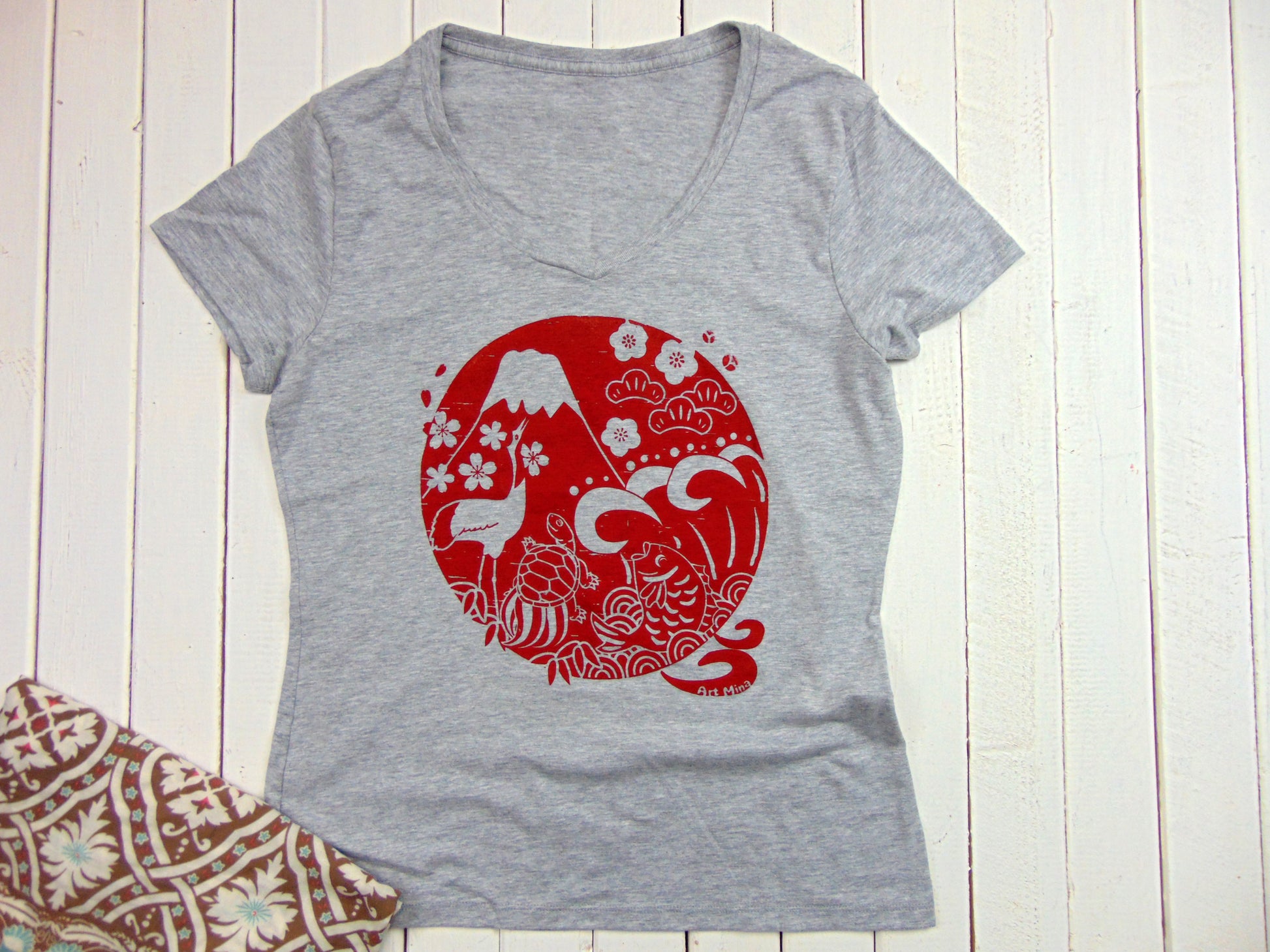 Women's Japan Good Luck ultra-soft V-neck T-Shirt with an Impressive Red Flag Motif. It's an ideal gift for moms and aficionados of Japanese culture alike.
